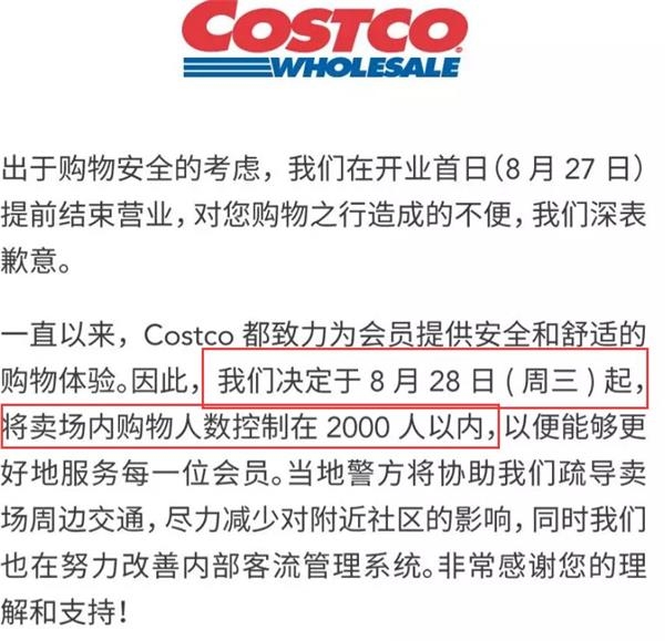 8月28日,休整一宿后的Costco再度开门迎客。同日中午,Costco就上海首店开业当天提前暂停营业作出说明,为因安全考虑而提前结束营业的状况致歉,表示将于8月28日起把卖场内购物人数控制在2000人以内,并将用短信及APP通知消费者卖场的最新状况。