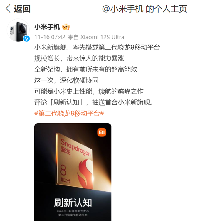 在新款手机方面,小米手机官方微博11月16日发文称,小米新旗舰,率先搭载第二代骁龙8移动平台,规模增长带来惊人的能力暴涨。全新架构,拥有前所未有的超高能效。这一次,深化软硬协同,可能是小米史上性能、续航的巅峰之作。