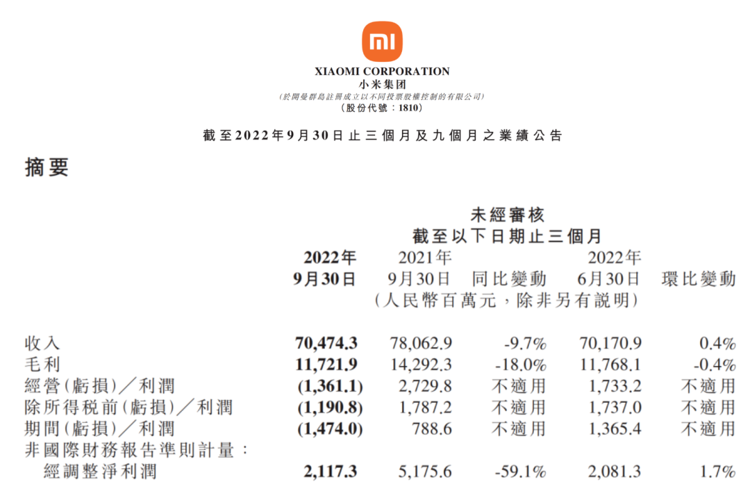 值得一提的是,11月23日,小米集团-W在港交所发布2022年三季报,该公司第三季度实现收入704.74亿元,同比减少9.7%;实现毛利率16.6%,非国际财务报告准则计量下经调整净利润21.17亿元,同比减少59.1%,其中包含智能电动汽车等创新业务费用为8.29亿元,本季度营收利润有所承压。