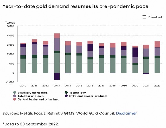 据世界黄金协会(WGC)的一份新报告,今年前三季度,黄金需求(不包括场外交易)同比增长28%,达到1181吨。这与2021年同期相比增加了18%,已恢复到大流行前的水平。与此同时,黄金总供应量小幅增加,同比增长1%,达到1215吨。