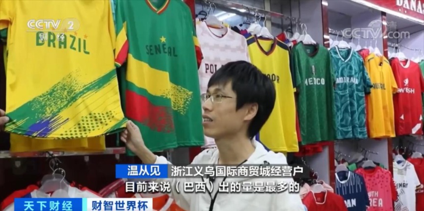 浙江义乌国际商贸城经营户温从见:目前来说巴西出的量是最多的,全世界在我这里订货的有接近50个国家,基本上都要顺带巴西的球衣。
