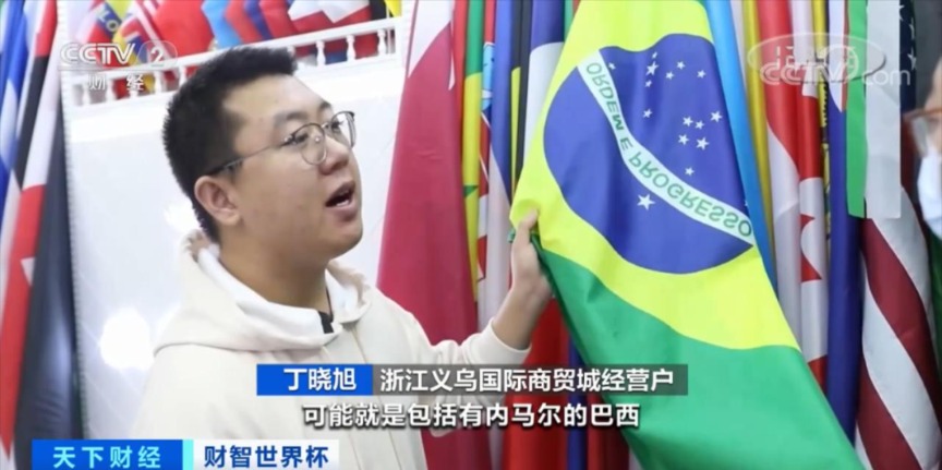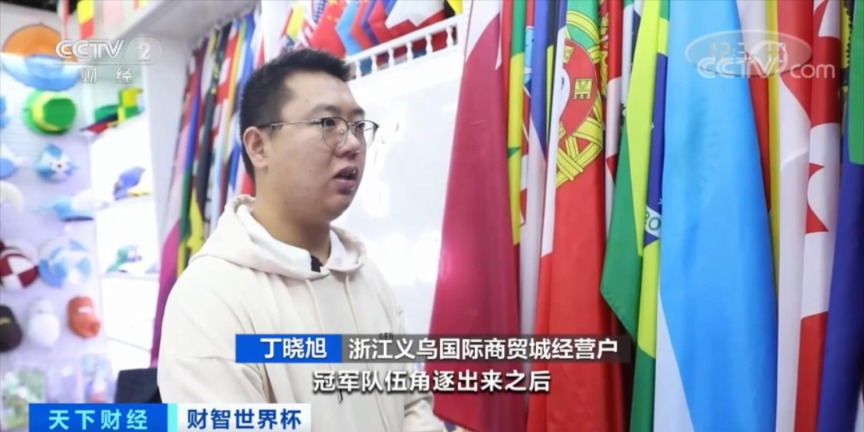 浙江义乌国际商贸城经营户丁晓旭:冠军队伍角逐出来之后,当天可能就会有当地的供应商,找我们订购相关的旗帜,还有庆祝产品。
