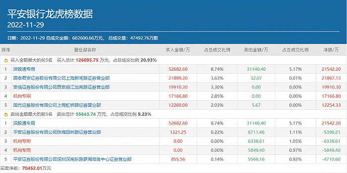 其中,深股通专用席位同时居于该股买卖双方榜首,买入金额为5.27亿元,卖出金额为3.11亿元,有一个机构专用席位位列该股买方第四位,买入金额为1.72亿元,也有两个机构专用席位出现在该股卖方前五位中,合计的卖出金额为1.22亿元。