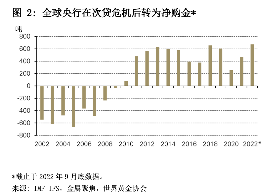 世界黄金协会提供的数据显示,全球央行在近几年持续购入黄金。截至9月底,2022年全球央行的净购金量达673吨,今年第三季度全球央行黄金净购买量为399.3吨,是去年同期4倍以上。今年是全球央行连续第13年净增持黄金储备,也成为有数据记录以来最高的年度净购金量。