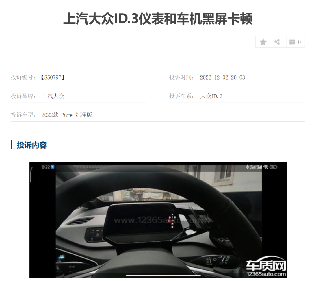 据了解,这些问题不是个例,据记者不完全统计,今年11月30日以来,仅车质网平台上关于大众ID.系列车型黑屏问题的相关投诉就超过百条。
