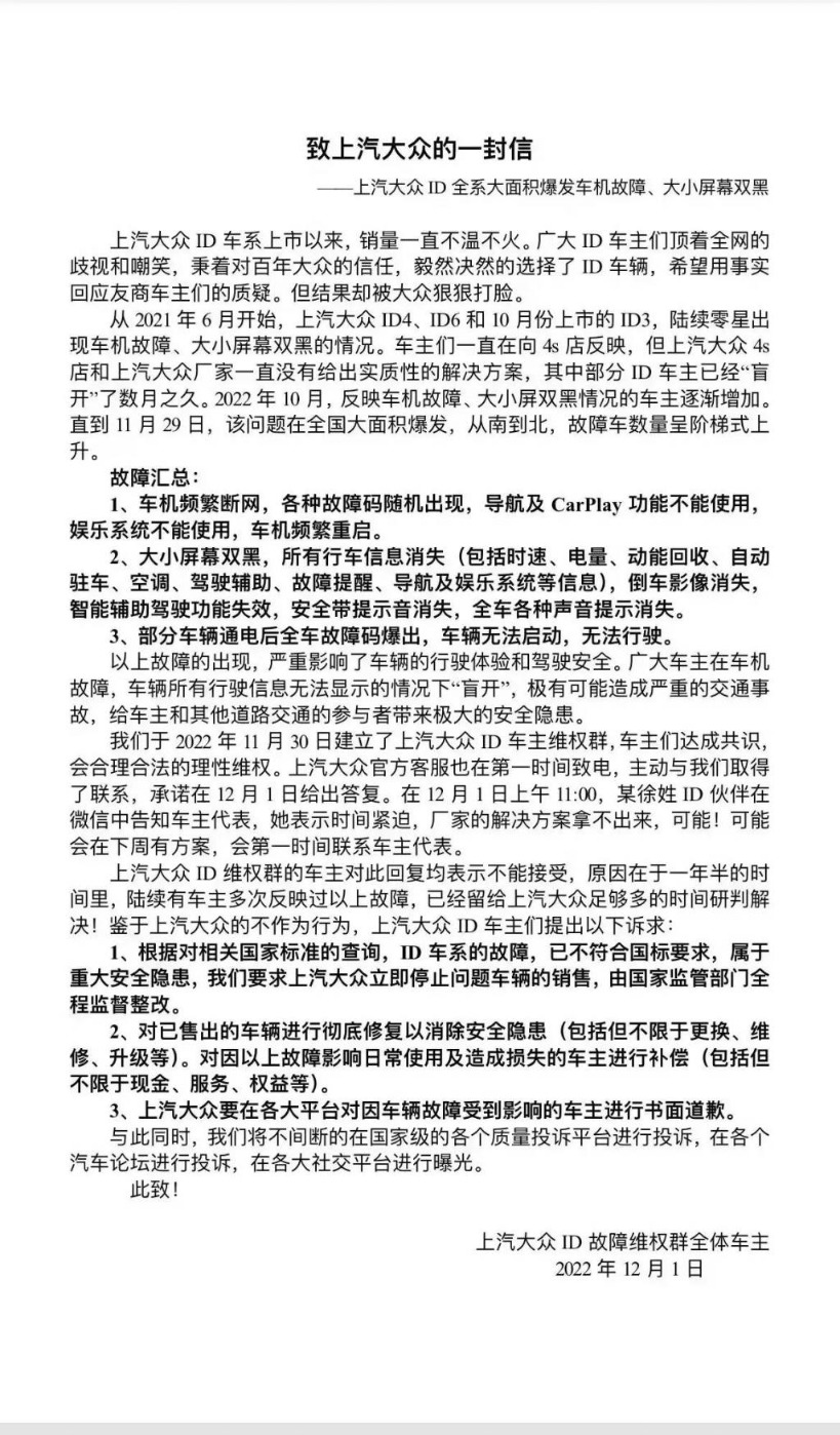 12月1日,维权车主还发布了《致上汽大众的一封信》,将故障汇总为三点: