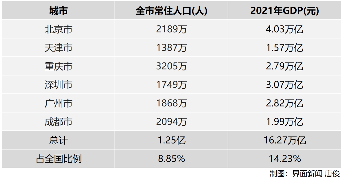 按照国务院城市规模划分标准,中国城市等级中最高级别是超大城市,城区常住人口在1000万以上。上述北京、深圳、重庆、广州、成都、天津均是人口超千万的超大城市。