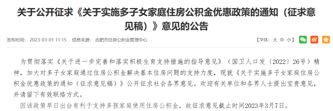 3月1日,合肥住房公积金管理中心发布《关于实施多子女家庭住房公积金优惠政策的通知(征求意见稿)》。
