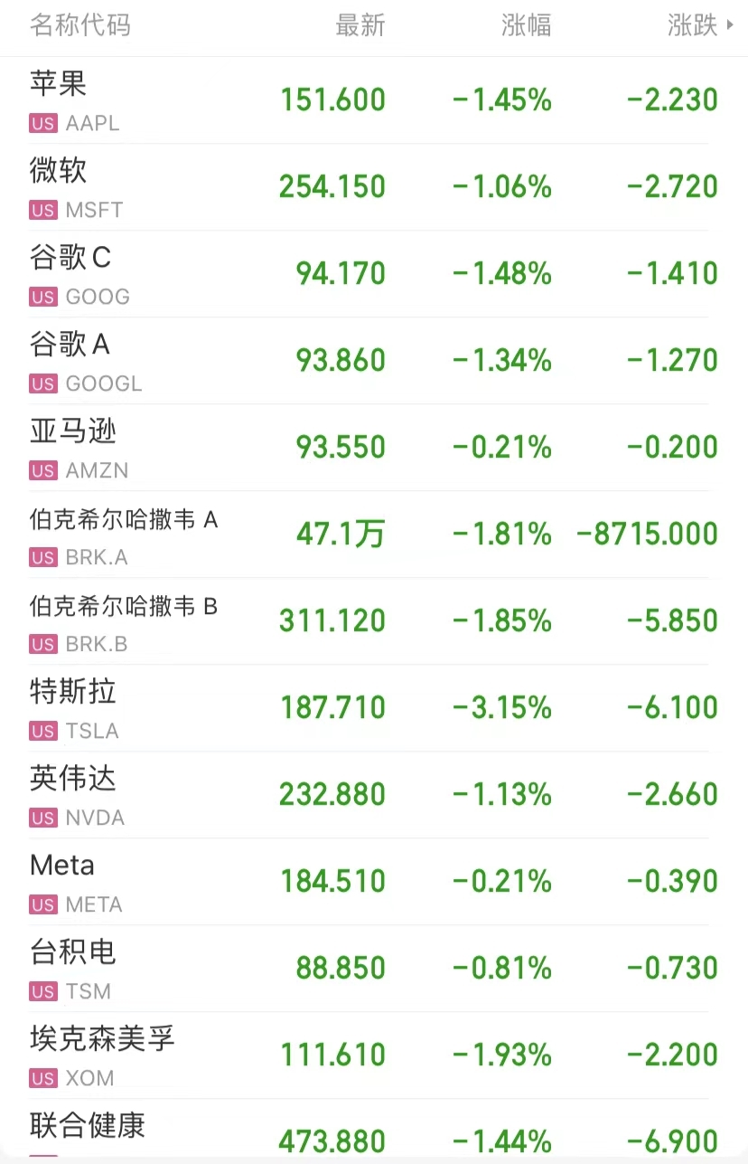 鲍威尔的上述表态吓坏了美股市场,三大股指全线收跌。美股三大指数收盘均跌超1%,道指跌1.72%,标普500指数跌1.53%,纳指跌1.25%。大型科技股普跌,特斯拉跌超3%,苹果、微软、谷歌、奈飞跌超1%;Meta小幅下跌。