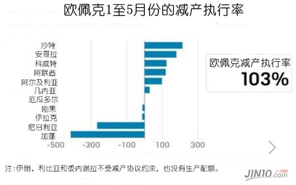在过去的半年里,油价上涨主要有两个方面的因素支撑,首先是欧佩克+于去年年底达成的减产协议,该组织决定从今年1月份开始减产120万桶/日,该协议持续半年时间。在1至5月份,欧佩克整体的减产执行率达到了103%,其中,沙特对减产协议的执行力度最大。而且减产效果也颇有成效,5月份欧佩克的产量已经下降至300万桶/日以下。