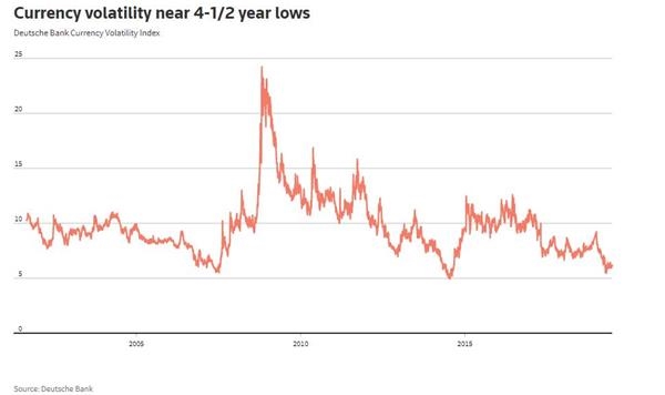 相比于黄金和原油市场的火热,外汇市场在这半年里则波澜不惊。外汇市场的波动率依然十分低迷,德意志银行的货币波动率指数自2017年以来已下降至4年多以来的最低水平,目前约为2019年初水平的三分之二,不到三年前峰值的一半。