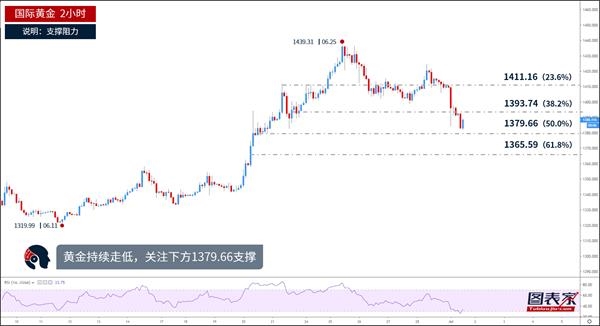 若金价持续下行,下方支撑位为斐波那契50.0%回调位1379.66,跌破后进一步支撑位见斐波那契61.8%回调位1365.59。