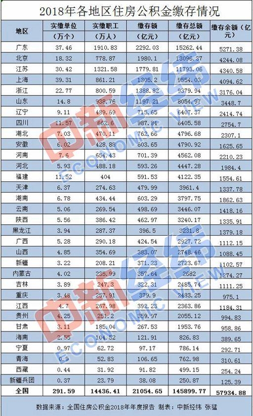 分地区来看,2018年广东缴存额达到15262.44亿元,位列全国第一,北京缴存额13096.37亿元紧随其后,江苏11793.06亿元位居第三。广东缴存余额5271.38亿元,同样居于首位。