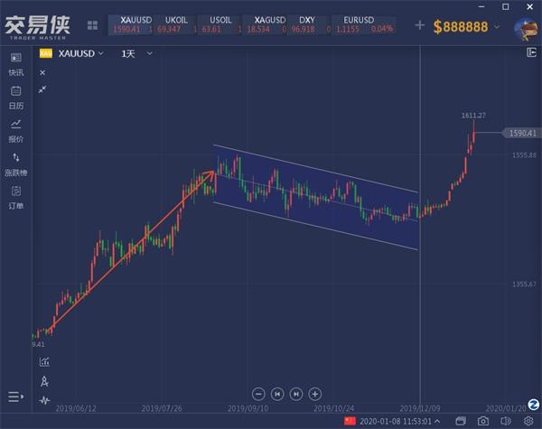 与酝酿了6个月的2019年黄金牛市不同,2020年1月才过了不到8日,整个金市便结束了持续4个月的震荡行情,建立了一个无比鲜明的上升旗形形态,黄金交易者们更是快陷入近乎疯狂的投机情绪之中。