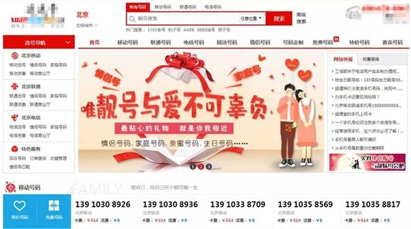 中新经纬记者在某搜索引擎检索关键词“靓号”,随即得到多个出售靓号的网站。某网站不仅出售三大运营商普通号,还出售三大运营商3连、4连、5连靓号,顺子号、豹子号、风水号以及定制生日靓号、情侣靓号、特殊意义靓号等。