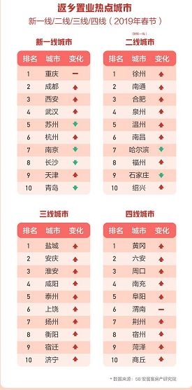 58安居客房产研究院首席分析师张波认为,返乡置业是近年持续热门的话题,同时由于品牌房企在三四线及以下城市布局的下沉化,拉动更多春节期间返乡人群关注当地楼市。从返乡人群的变化来看,用户不但会关注地县级城市的项目,同时还会关注到本省更为核心的二三线城市。加之落户政策放松,二三线城市春节期间的找房热度有望创出新高。