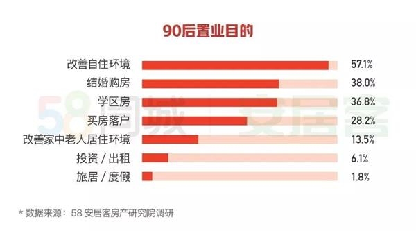 单从90后来看,改善自住,结婚购房是主流。90后群体中选择返乡置业的人群占比67.5%,返乡置业的主要原因为大城市的房价较高,压力较大,而回乡买房的价格更容易接受。90后购房除了改善自住环境外,为结婚而购房排在第二名,占比38%。