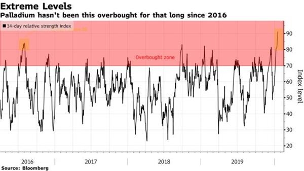 从技术面来看,一些分析师预计钯金将大幅回调。钯金的14天相对强弱指标已经连续7天保持在80以上,为2016年以来最长时间。