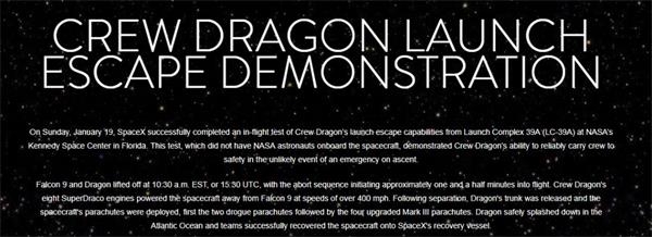 1月19日,马斯克旗下的太空探索公司SpaceX成功完成了载人龙飞船(Crew Dragon)逃生系统测试,离载人飞行更近一步。