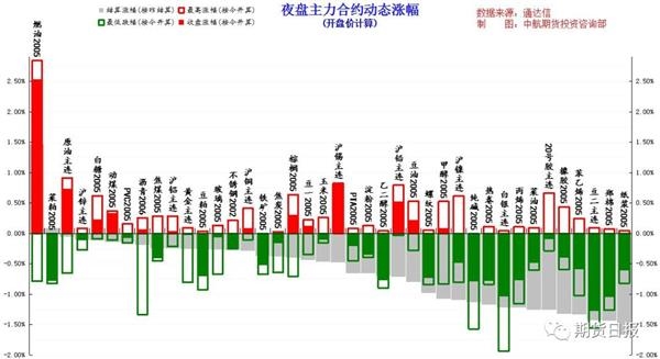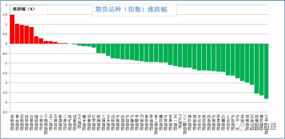昨日期货市场绝大多数下跌。涨幅较大的是菜粕(1.58%),黄金(1.03%),豆粕(0.96%),硅铁(0.93%),白银(0.86%);跌幅较大的是20号胶(2.81%),橡胶(2.65%),棕榈油(2.55%),豆油(2.1%),棉花(1.98%)。