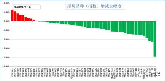 昨日期市品种绝大多数减仓。增仓幅度居前的是上证50(6.35%),沪深300(5.47%),焦炭(4.33%),中证500(3.6%),丙烯(3.39%);减仓幅度居前的是豆二(19.53%),豆一(11.35%),纸浆(10.81%),淀粉(9.41%),苯乙烯(8.31%)。