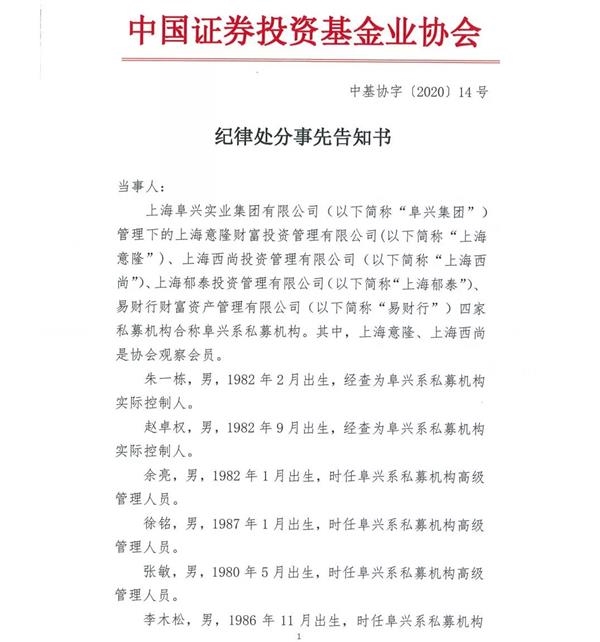 1月14日,中国证券投资基金业协会发出纪律处分事先告知书,取消两家阜兴系私募机构的会员资格,并将阜兴系两名实际控制人朱一栋、赵卓权加入黑名单,期限为终身。