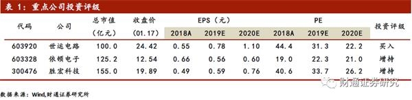 我们选取可比的7家PCB上市公司,从一致预期来看,2020年1月15日收盘价对应2019年PE水平在20.3-50.3倍之间,龙头公司2019年PE估值水平都在35倍以上,多数公司2020、2021年两年的预测增速在25-30%。世运电路未来两年的业绩复合增速40%左右,预计2019-2021年EPS为0.78元、1.10元、1.54元,对应的PE分别为32.1倍、22.7倍、16.2倍,相比同行业的可比公司,世运电路的估值在行业中处于较低水平,维持公司“买入”评级。