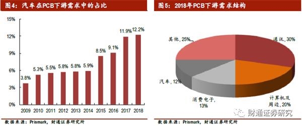 汽车是PCB下游第四大应用,2018年全球车用PCB的产值规模约76亿美元。随着消费者对于汽车功能性和安全性要求日益提高,汽车电子化程度不断增加,车用PCB市场因而受益,近十年来自车用PCB需求占比从3.8%提升到12.2%,实现远高于PCB行业平均增长速度。