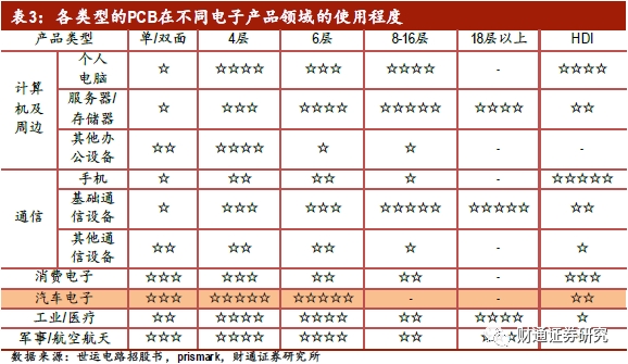 PCB 作为一切电子元器件的支撑,广泛应用在汽车电子中。根据Prismark统计,汽车电子领域的PCB需求主要以低层板、HDI板和挠性板为主,其中,HDI板和挠性板占比达33.3%。