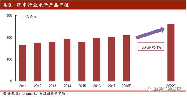据Prismark测算,汽车行业电子产品的产值2018年将达到2080亿美元,2018-2022年汽车电子产品产值的年复合增长率达5.1%。