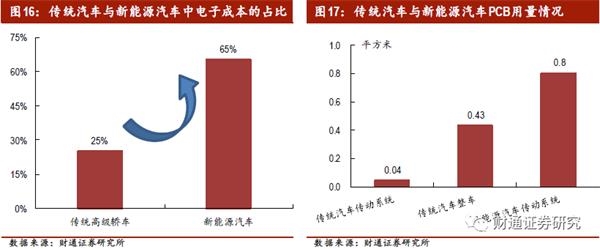 新能源汽车的电子化趋势带动车用PCB需求大增。新能源汽车与传统车最大的区别在于动力系统,因此新能源汽车PCB的增量主要来自车载充电机、电池管理系统(BMS)、电压转换系统(DC-DC、逆变器等)以及其他高压、低压器件。据测算,传统燃油车的内燃机以及传统系统中,PCB的用量仅为0.04 平方米左右,一辆电子化程度中等的燃油车全车所需要的PCB 合计仅为0.43 平方米左右,而新能源汽车仅动力总成的相关设备上PCB的用量就达到0.8平方米。一般而言,传统汽车的PCB单车配套价值量500元左右,新能源汽车的PCB单车配套价值量1200元左右。