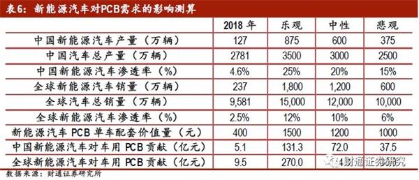 新能源汽车发展进入快车道,汽车电子PCB迎来发展机遇。2018年,中国新能源汽车产销规模超过120万辆,渗透率接近4%,全球新能源汽车产销规模接近240万辆。受益新能源汽车产销规模增长以及单车配套价值量提升,我们认为,汽车电子PCB需求将大幅提升,中性假设下,新能源汽车PCB单车配套价值量1200元,远期中国新能源汽车产销规模达到600万辆,全球新能源汽车1200万辆,中国和全球新能源汽车对车用PCB需求的贡献分别为72亿元和144亿元。