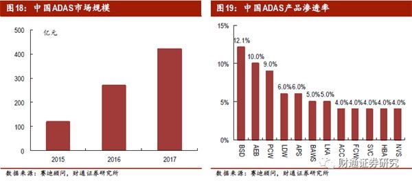 汽车安全安全要求提升和汽车消费升级趋势下,ADAS系统从高端市场向中端渗透,汽车电子化程度进一步提升。ADAS是智能驾驶辅助系统(AdvancedDriver Assistance System)的简称,是一种利用安装于车上的各式传感器,收集车内外的各种环境数据,实现主动安全的技术。ADAS系统以前在高端车型中装配较多,现在随着安全意识和消费能力的提升,部分ADAS功能也逐步成为中端车型的主流配置,如自适应巡航、自动刹车、道路偏离预警等。ADAS系统中使用的传感器、控制器、安全系统里的零部件都是以电子件为主,且集成较高。据赛迪统计,中国目前ADAS市场规模400亿元左右,各类ADAS产品的渗透率5%-10%,国内的ADAS市场规模和渗透率仍在高速增长中。根据Technavio的研究,2017-2021年中国汽车ADAS市场复合年增长率有望达到35%。