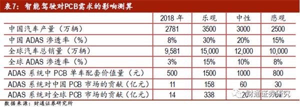 智能驾驶虽远必至,车用PCB市场前景广阔。ADAS系统中的多种操作控制、安全控制、周边控制功能都需要PCB来实现,未来的智能汽车有望装配更多的汽车电子产品实现无人驾驶需求,进一步提升PCB单车配套价值量。中性假设下,远期ADAS国内渗透率达到20%,全球渗透率15%,ADAS系统中PCB的单车配套价值量1000元左右,那么ADAS市场对中国和全球车用PCB下游需求的拉动分别为60亿元和120亿元。