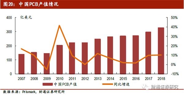 PCB产业主要分布于欧美、日韩、中国大陆、中国台湾等地区。2000年以前,美洲、欧洲和日本三大地区占据全球PCB生产70%以上的产值,但近十年来,由于劳动力、资源、政策、产业聚集等方面的优势,全球电子制造业产能向中国大陆、台湾和韩国等亚洲地区进行转移,2006年中国超越日本成为全球PCB 行业最大的生产基地。2018年中国大陆PCB产值326亿美元,全球PCB产值635亿美元,我国市场份额占比51.3%。