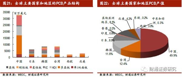 全球PCB产值集中在中国大陆、中国台湾以及韩国,其中中国大陆的份额约占全球市场的50%左右。据WECC统计,2018年全球PCB产值654.9亿美元,中国PCB产值326.8亿美元,占全球市场的份额49.9%。2018年中国市场的PCB的中,单/双面板、多层板、HDI、柔性板的比例分别为7.5%、44.8%、21.2%和22.6%。