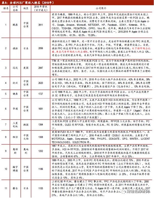全球PCB产业第一梯队的厂商仍以台湾、日本企业为主,但中国大陆企业有望后来居上。根据Prismark公布的“2018年全球PCB厂商前30排名”榜单,台湾企业上榜13家,日本、韩国有7家和5家上榜,中国大陆的维信(东山精密)、深南、景旺分别居第8名、12名和25名;按产值来看,前30名PCB企业中台湾企业总产值175.2亿美元,占比达46.1%。中国大陆的PCB企业受5G、新能源车需求的爆发,中国大陆PCB厂商成长迅速,有望后来居上,如崇达、兴森、奥士康等等。