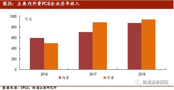 中国有着健康稳定的内需市场和显著的生产制造优势,吸引了大量外资企业将生产重心向中国大陆转移。据Prismark统计,近五年全球PCB产值的平均增速为3.2%,中国PCB产值的年复合增速是最快的,为3.7%。根据CPCA公布的内外资PCB公司的收入情况来看,近3年内外资PCB产值不断增长,且内资企业的收入与外资有缩小趋势。