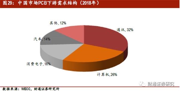 汽车是中国下游市场主要应用之一。根据WECC 统计,2018年中国PCB应用市场最大的是通讯类,占比为32%;其次是计算机,市场占比为26%;汽车电子的市场占有率为14%。