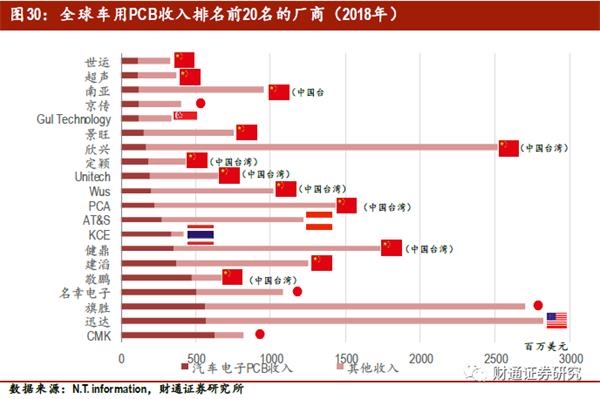中国大陆多家大陆企业的汽车电子PCB收入规模已经位居全球前列。根据N.T.information统计,2018年全球车用PCB收入排名前20的厂商中9家企业来自中国台湾,中国大陆的景旺、超声、世运已经位居第15、19和20名。相比传统汽车的供应链,新能源汽车的供应链更开放,加上国内的新能源汽车市场占全球将近一半比重,中国本土的供应商将率先分享新能源汽车的红利,自主PCB企业借助贴近下游市场的优势,有望在汽车电子PCB市场进一步大展拳脚。
