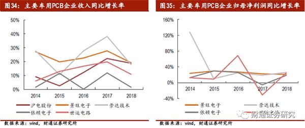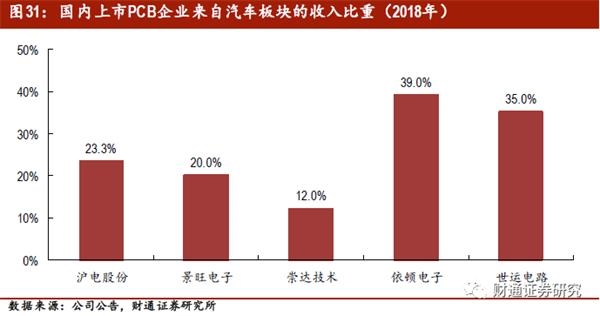 目前国内A股上市PCB公司有12家,汽车业务占比较高的上市公司有依顿电子、世运电路、沪电股份、景旺电子和崇达技术,2018年汽车业务对收入的贡献分别为39%、35%、23.3%和20.0%。