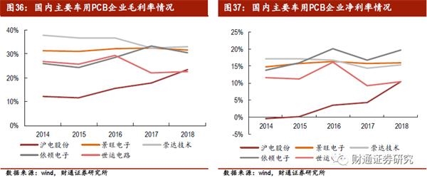比较这5家车用PCB上市企业,2018年收入规模在20亿元-55亿元,归母净利润规模2亿元-8亿元,毛利率水平为20%-35%,净利率水平为10%-20%。