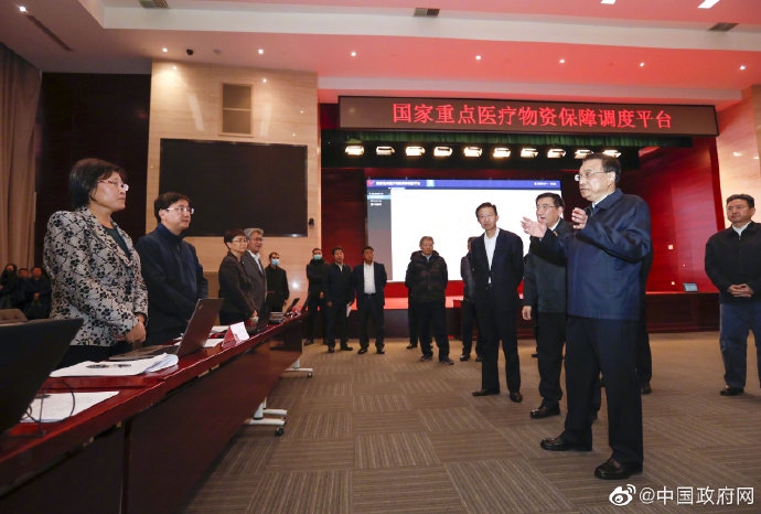 李克强2月1日来到应对新型冠状病毒感染肺炎疫情国家重点医疗物资保障调度平台,详细了解医用防护服、医用口罩、药品等重点医疗物资生产、调度和保障情况。