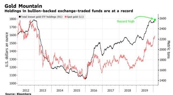 据彭博社统计显示,全球黄金ETF的持仓量上周攀升至2573.9吨,创下2012年以来新高。