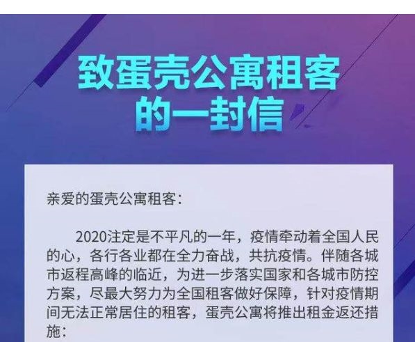 2月3日,蛋壳公寓也在其官方APP上发表了《致蛋壳公寓的一封信》。信中对武汉和其他各城市租客的都有相对应的补贴政策。