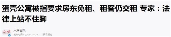 而租户不满,房东也不满。据人民日报2月9日报道,近日多地蛋壳公寓房东反映:蛋壳公寓以疫情为由,既要求房东减租,又要求房客交租。