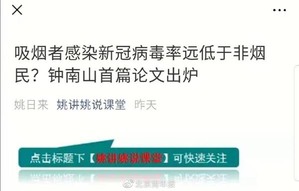 昨日,一个名为“姚讲姚说课堂”的微信公众号发表了一篇题为《吸烟者感染新冠病毒率远低于非烟民?钟南山首篇论文出炉》的文章,作者为姚日来。该文章截取钟南山团队2月9日发表的论文中的部分数据,得出“明显吸烟者感染率远低于非烟民”的结论,还称吸烟能够驱邪治病。对此,北京市控烟协会会长张建枢斥责,“姚讲姚说课堂”是一个为烟草行业推销鼓吹的微信公众号,对钟南山团队的论文数据进行了断章取义,“根本无法得出这样的结论,这是烟草行业的故伎重演,当年非典时期就散布谣言说非典感染者中吸烟的少,这个谬论早已被批驳了。”北京市控烟协会已经与钟南山团队取得了联系,对方在回应北京市控烟协会时表示,根本不能同意这种说法,正在研究此事,随后将作出反应。