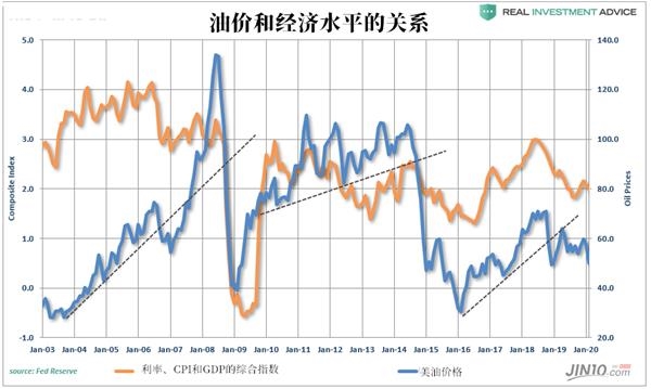 下图将利率、通胀和GDP合并为一个综合指标,我们能更清楚看到油价和经济表现的相关性。