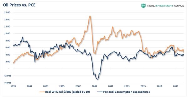 而当我们拿(经通货膨胀调整后的)美油价格和个人消费总支出(PCE)进行比较,我们可以发现正如2009年那会,当油价陷入低迷,个人消费支出确实得到极大的提振。