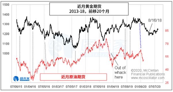 分析师Tom McClellan认为,黄金价格的走势往往会在20个月后的原油价格走势中再次出现。换言之,黄金是原油的领先指标。